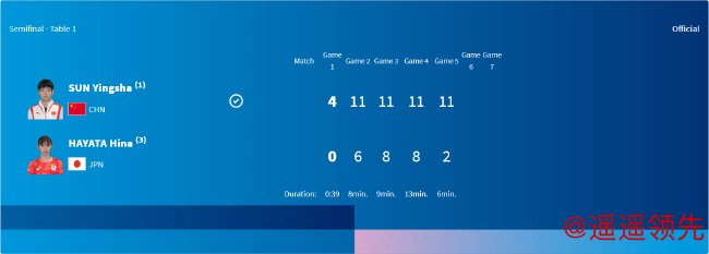 第四局,双方开局又是战成1平2平。此后,孙颖莎打出一波9-0,以11-2再胜一局,大比分4-0横扫进决赛。