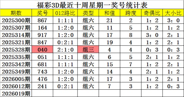 福利彩票3D第2026018期奖号为494。 福利彩票3D上周一:第2026012期奖号为241。 奖号类型分析:从近期......
